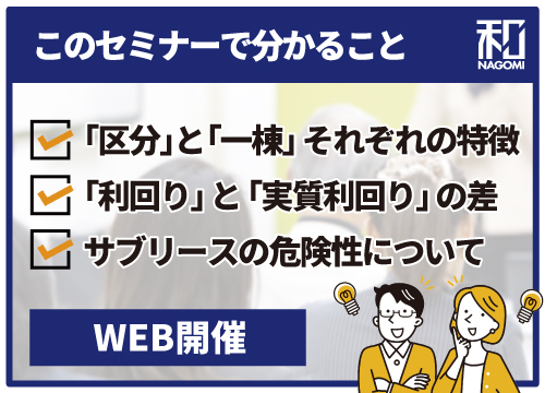本セミナーでは、「区分」と「一棟」の違いについて解説します。どちらだけが優れているということはありません。あなたの目標を達成するにはどちらが最適か、ぜひセミナーでご確認ください!