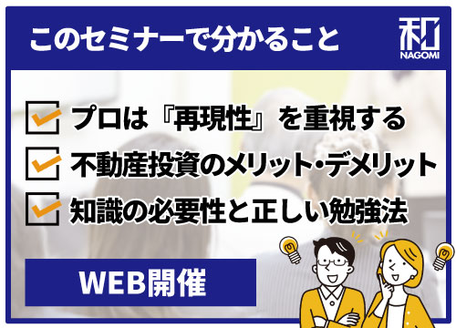 | 特典 | 【セミナー参加者全員特典】 ①代表・仲宗根の執筆した著書の中からお好きな1冊プレゼント! ②雑誌、新聞など過去のメディア掲載資料プレゼント! ③マンション投資がアニメで分かるオリジナルアニメDVDプレゼント! ※③はセミナー後の無料個別相談に参加した方のみ |